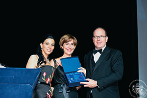 第二回ガラ・ナイト(2014)にて。モナコのF1グランプリ開催一週間前に行われ、故アイルトン・セナ氏への敬意が表されたという。故セナ氏の実姉でアイルトン・セナ財団代表のヴィヴィアン・セナ女史(中央)、アルベール二世公(右)とともに。