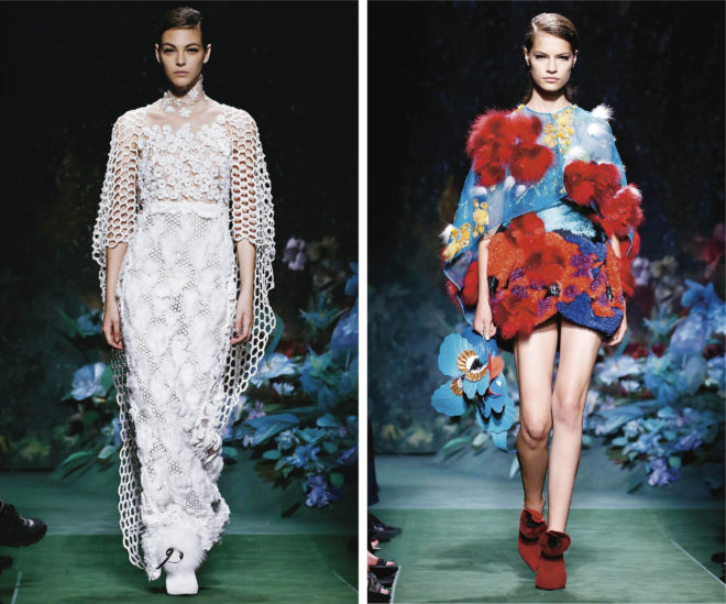 左から/フラワーレースウィングケープドレス。ミンクの刺繍とミンクのネットケープを施したホワイトレース。 ウイングケープとミニドレス。ケープはミンク、 フォックスフラワー、フェザーをアップリケした手染めオーガンジー 。