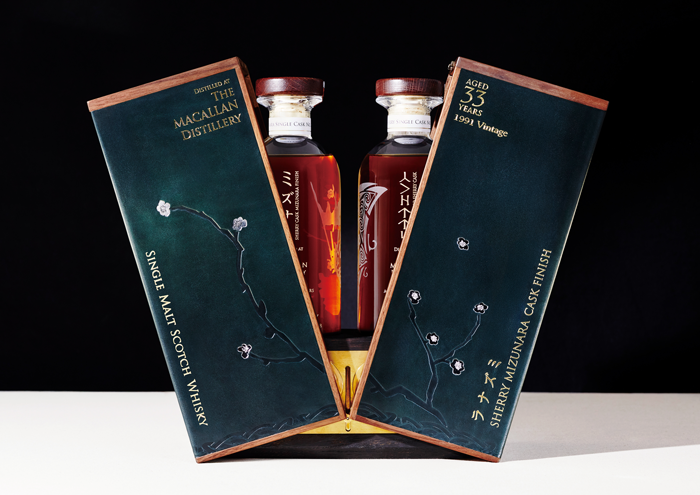 D ボトルは、英国のグレンケアンクリスタル社に製作してもらいました。シェリー樽のボトルにはピクト族(ケルト人)の三日月型の斧と、強さと勇気を象徴する矢の彫刻を施し、ミズナラ樽のボトルには扇が桜の花に変化し、力強く開花していくさまを描いています。ボックスは植物タンニンなめしのレザーと“焼杉板”の技法を用いたオーク材によるもので、同じく英国のビル アンバーグ スタジオと共作しました。特別な設計により、開くと2つのボトルがエレガントに表れる仕掛けなのです。