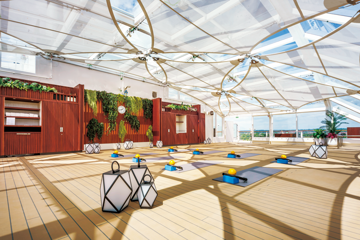 デッキ8の中央に広がる「グランドプール」は、2つの温水ワールプールとデッキチェア、テーブルを備えた開放感あふれる船上リゾート。新たに足湯が設けられ、洋服のまま気軽に利用できるのも魅力だ。観光やアクティビティの合間に心地よい潮風を感じながら、日本の四季が描き出す景色を堪能したい。