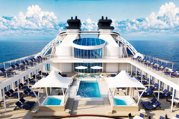 (1)2026年9月に就航する「三井オーシャンサクラ」。小回りの利く船体で多彩な寄港地へ向かい、受け継がれた美食とサービスで心に残る船旅を届ける。(2)客室は全室オーシャンビューかつスイート仕様で、約9割にベランダを完備。一部客室にはバトラーサービスや特典もついてくる。(3)「グランドプール」では、開放感あふれる船上のリゾート空間を感じられる。足湯やレストラン&バーも併設され、洋上で風を感じながら景色や四季の移ろいを楽しめる。(4) 大海原を一望できる「バー海」。朝焼けから夕暮れ、満天の星空まで、移り変わるパノラマビューとともに、朝は軽めのお食事とカフェを、夜はシグネチャーカクテルなど幅広いドリンクセレクションをご用意。