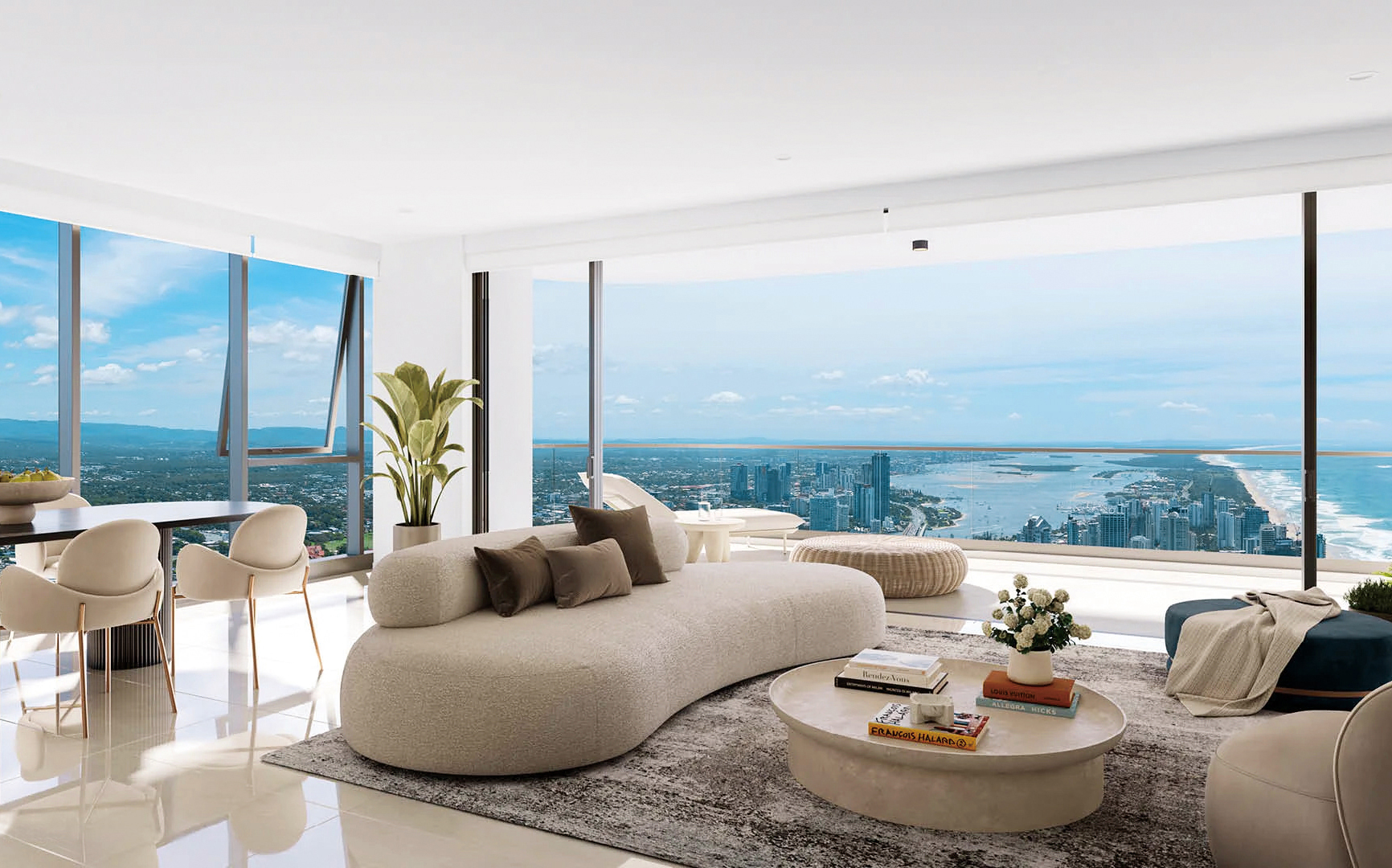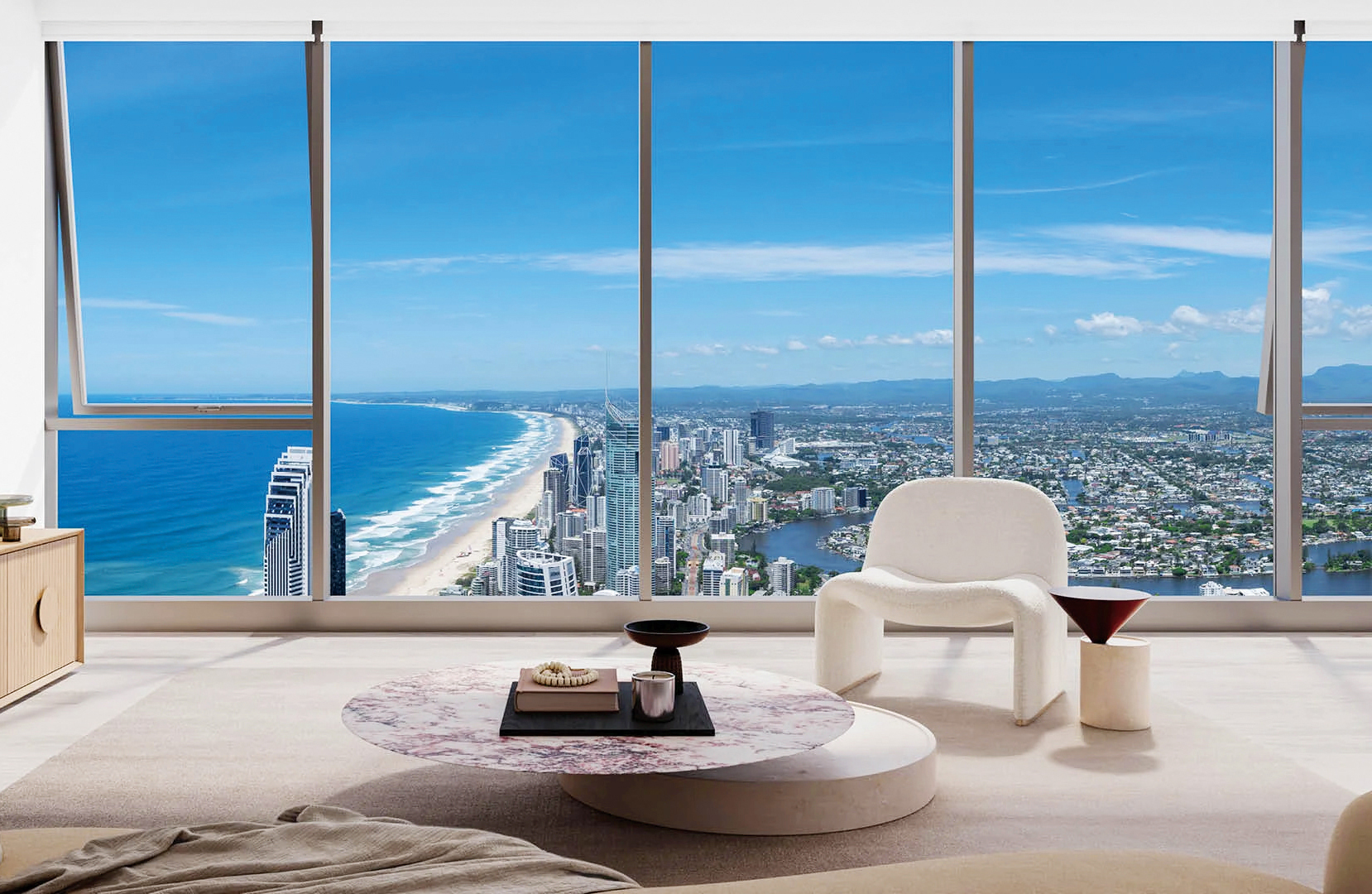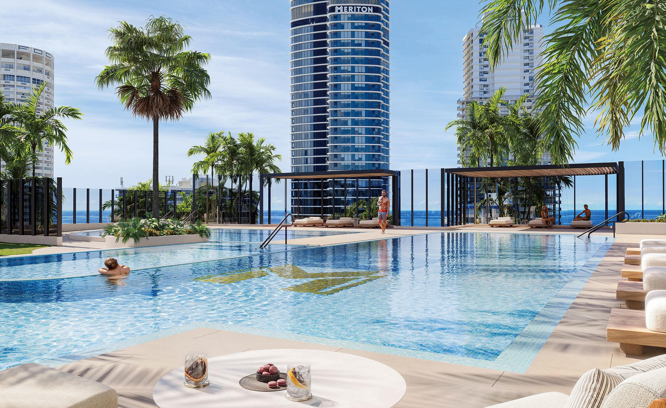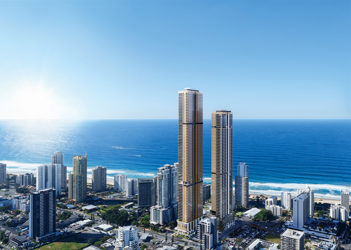 オーストラリア最大のデベロッパーであるメリトン社の自信作である5つ星のレジデンス「サイプレス・パームズ」。サーファーズ・パラダイスの中心地、ゴールドコーストで最も賑わう中心地からわずか一駅の場所にそびえたつ。クイーンズランド州では一番の高さとなる300mを誇る76階(賃貸棟)と90階(分譲棟)の2棟で構成されている。そのため、サーファーズ・パラダイス・ビーチ、バーレイ・ヘッズ、メインビーチ、ブロードウォーター、そしてネラン川越しに緑豊かなヒンターランドまで、遮るもののない眺望が何よりの魅力となっている。建物にはレストラン、スーパーマーケットなど様々な施設が構成され、トロピカルガーデンをはじめ共用施設も充実している。