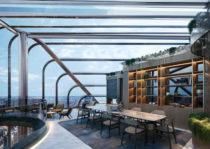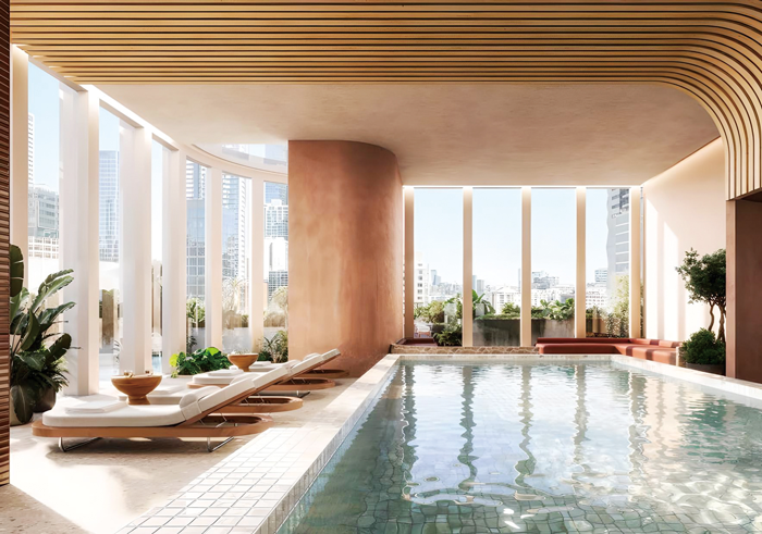 建物の9階と8階には、350㎡を超える3つの連結プールが設けられ、ウォーターラウンジ、オープンスパ、キッズ用の滝付きのインフィニティエッジプールも備えている。他にもスーパーマーケット、カフェ、世界クラスのレストランが集まる1階のショッピング&ダイニングエリアなど充実した設備はまさにラグジュアリーレジデンスといえるだろう。