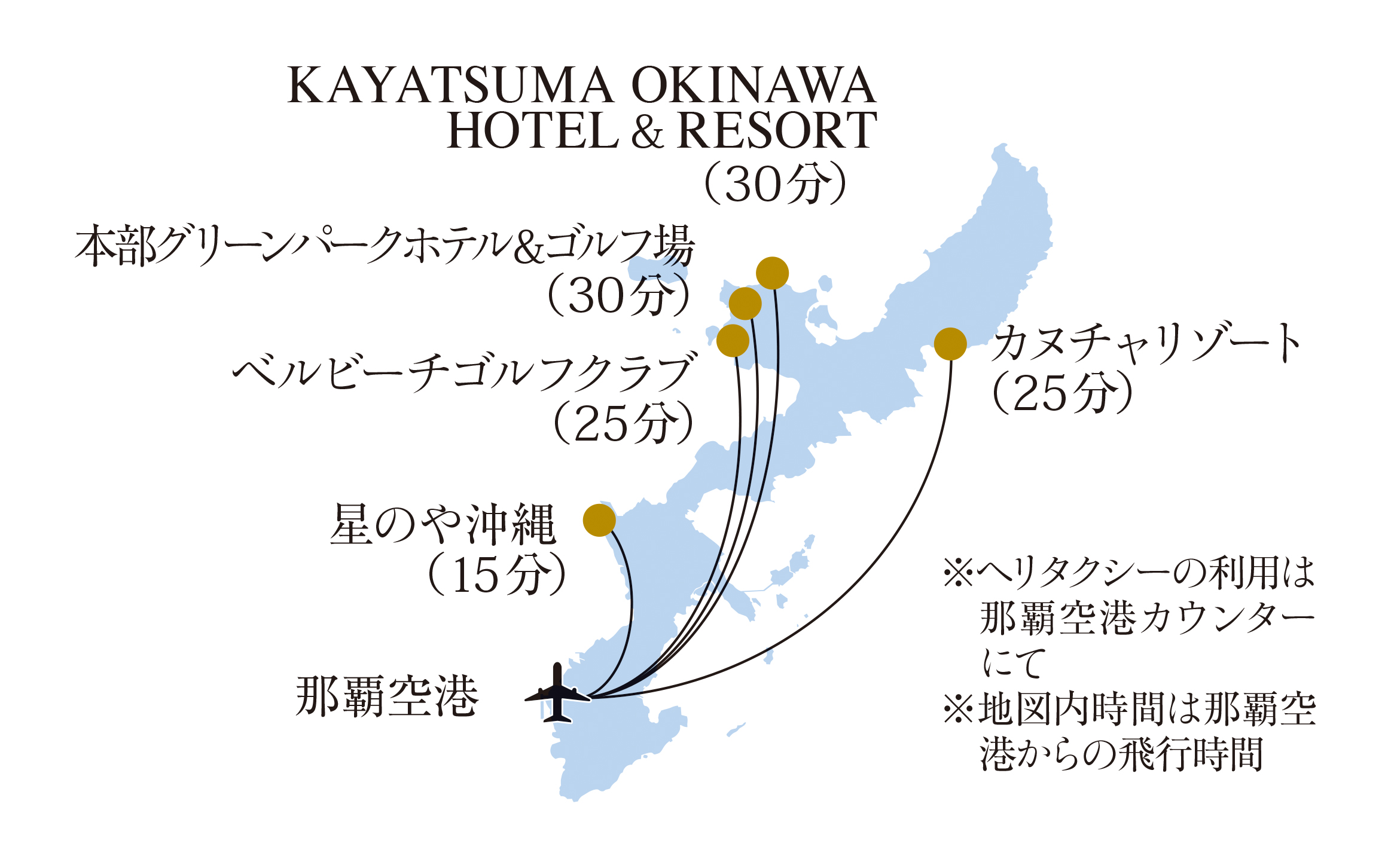 そのニーズに応える解決策として、沖縄本島ではヘリタクシーの利用が進んでいる。那覇空港からの本島各地へのフライトが運営されていて、海外からの旅行者を含む、ヘリ利用のニーズが急増しているため、本島周辺の離島を含めヘリが発着可能な場所も増えてきている。このように沖縄本島は、ヘリタクシーの運航が非常に発達している場所となっている。