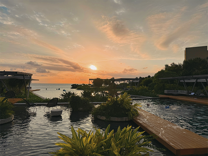 (2)『星のや沖縄』を象徴するインフィニティプール。「ティーダ」に滞在すると、客室プール、そしてプライベートビーチと、すべてを堪能することができる。
