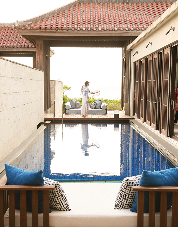 (1)特別室「ティーダ(太陽)」客室内からプライベートプールとその先の海を望む。ファミリーでもカップルでも滞在を楽しめるマルチユースの最上級スイート。モデルが纏う、美しき琉球紅型のスカーフの鮮やかな光彩がひと際、映える。