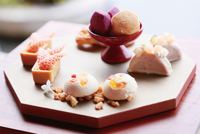 (4)インルームダイニングでは、ファインダイニングのテーブルそのままが客室内に運ばれてくるかのような贅を極めた逸品をコース仕立てで堪能できる。