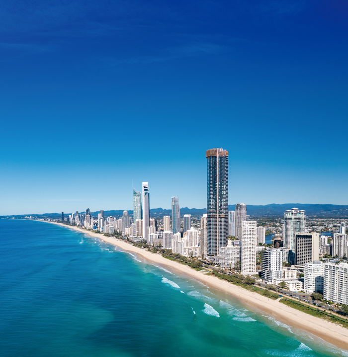 ゴールドコースト・サーファーズパラダイスから橋を渡ったシェビロン島に2年後に完成するこの「シェビロン・ワン」。ビーチへは徒歩7分。路面電車の駅も近く、周辺にはスーパーや店舗もそろっている。ゴールドコーストはロックダウンすることもなかったため、不動産価格は順調に値上がりをし続けている。なおこの地域には現在109億ドルを超える大規模な施設やインフラ投資が行われていて、ニューサウスウェルズ州までの鉄道の開通など、今後の発展にも期待が持てる。物件は1ベッドルームが8000万円前後、2ベッドが1.4億円前後の価格帯。何よりこの物件から見渡せる景観のすばらしさはゴールドコーストの物件ならではの魅力にあふれていると言えるだろう。この地域の賃貸料金は毎年3%〜4%の上昇を示しており投資案件としての価値も高い。この建物のデベロッパーは豪州でワイナリー、プライベートジェット、ヘリなどを所有している成功した企業。物件の購入は10%の頭金の支払いと弁護士費用の2000ドル〜2年の完成時期にその他の費用を払うことになる。詳細は左ページ、GIMへお問い合わせください。