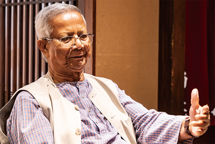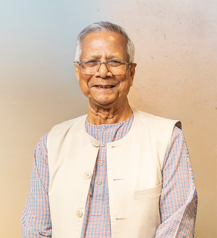 1940年6月生まれ。1972年チッタゴン大学経済学部長。1976 年貧困救済プロジェクトをジョブラ村にて開始。1983 年グラミン銀行設立。2006年ノーベル平和賞を受賞。経済的利益と社会的利益の両立を目指すソーシャル・ビジネスという概念を世界に普及。2024年反政府デモにより辞任したハシナ前首相に代わり、国民からの強い支持を受け暫定政権の首席顧問に就任。2026年2月総選挙により誕生した新政権に政治を委ね、自身はグラミン銀行のトップに戻る。