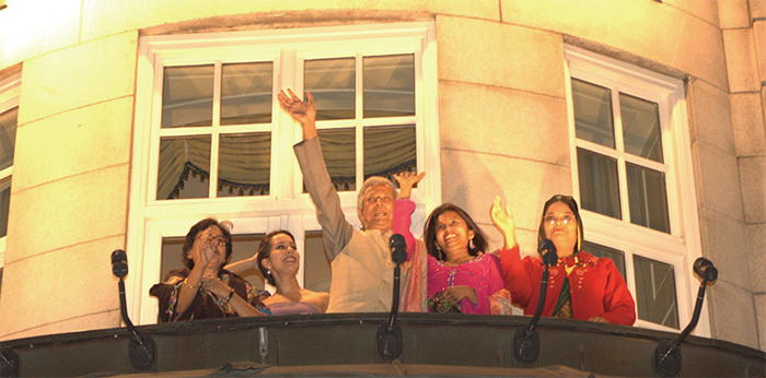 上/ノーベル平和賞受賞を受け市民に挨拶するユヌス氏