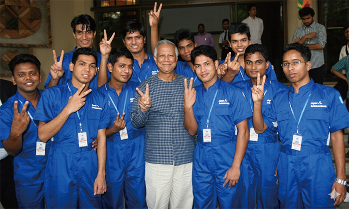 実はユヌス氏は以前からバングラデシュの貧困家庭に生まれたために、学力優秀で人格も素晴らしいにもかかわらず高等教育を受けられない若者に日本語と自動車整備技術と日本の礼節を教育するジャパン・オートメカニック・スクールを開校し、卒業生が日本で働く機会を提供することに取り組んでいる。この取り組みに賛同しバングラデシュの若者の採用を積極的に推進しているジーライオングループの創業者である田畑利彦氏の支援のおかげで、多くの若者が日本で安定した仕事を得て家族を支えることができるようになっている。ユヌス氏はこのモデルが大きな可能性を持つことを実感していたのである。