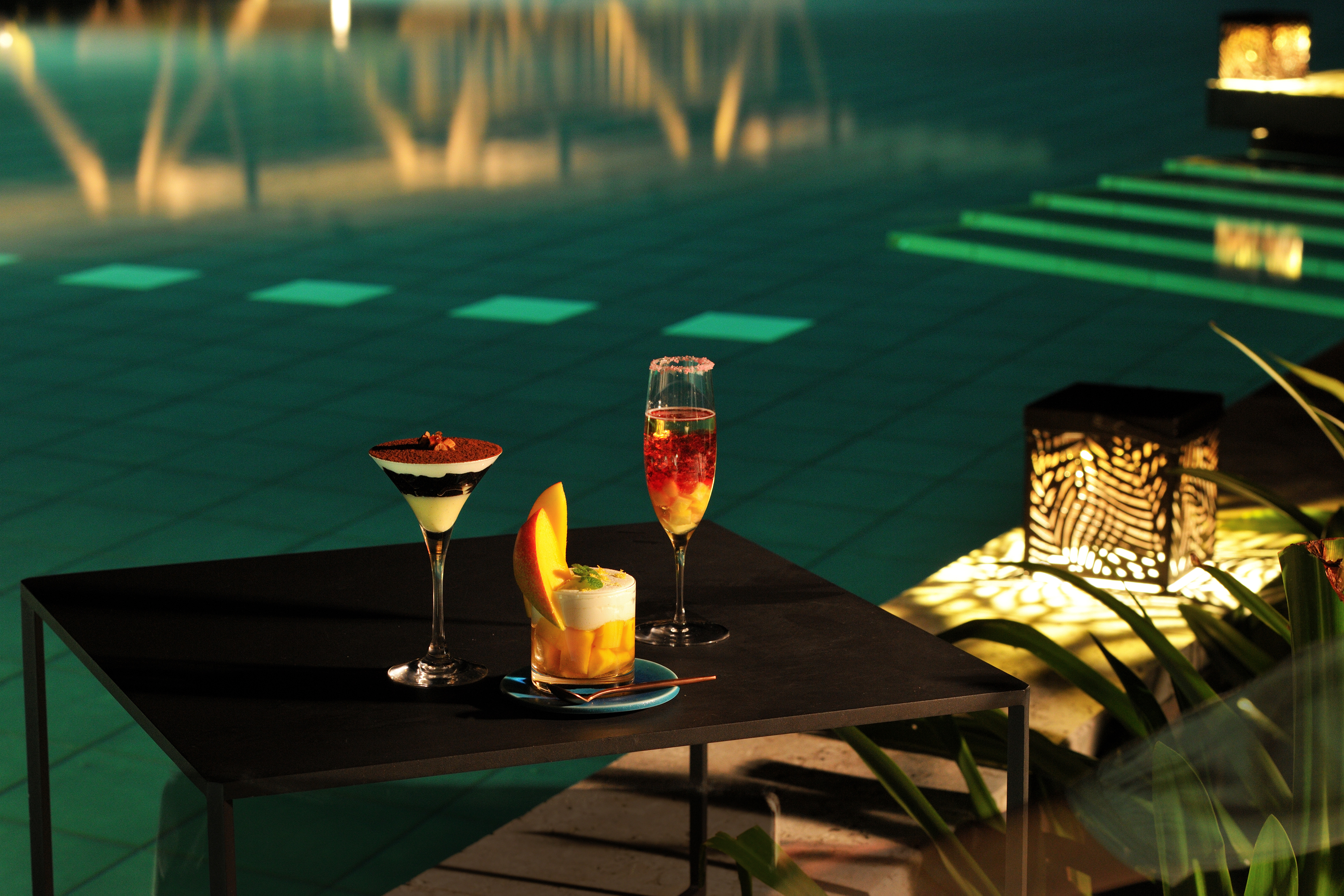 『星のや沖縄』では、日中も、そして夜も、都会的なデザイン性と海と空が溶け合うスタイリッシュなインフィニティプールでシャンパーニュを味わう至福のひとときを提案致します。夏の沖縄は連日猛暑が続く本土と比べると猛暑日がほとんどなく、心地よい風に包まれます。中でも、波音と静寂に包まれ、水中照明が灯る幻想的な空間へと姿を変えるナイトプールの情景は、まさに大人の滞在を彩るグラマラスなワンシーン。海から渡る心地よい風を感じるプールサイドでは、5月15日より夕刻から深夜までの移ろいゆく夜の時間を、3つのシーンに合わせたカクテルとともに楽しめます。夕陽を望むアペリティフから、星空の下で味わうデザートカクテル、そして深い夜に沖縄の酒を嗜むひとときまで―――。涼やかな風を感じながら、心身を解き放つ贅沢な時間を堪能ください。