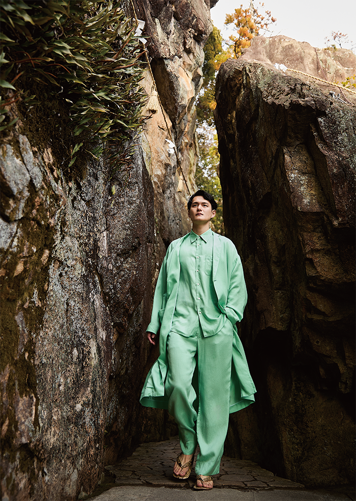 葦×テンセルのオリジナル生地は、シルクを思わせる艶とドレープが魅力。たっぷりとしたシルエットが風を味方につけ、美しくはためく。そして、清麗なライトグリーンは神々しささえ感じさせる。