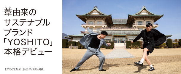 「YOSHITO」は、2025年にスタートした滋賀発のファッションブランドだ。琵琶湖に自生する葦(よし)を用いたオリジナルファブリックによるエイジレスかつジェンダーレスなジャケットやコート、パンツは風をはらみ、美しくドレープする。今回「PAVONE」は滋賀出身の芸人・九条ジョーをモデルに、滋賀の歴史的建造物で撮影を行った。